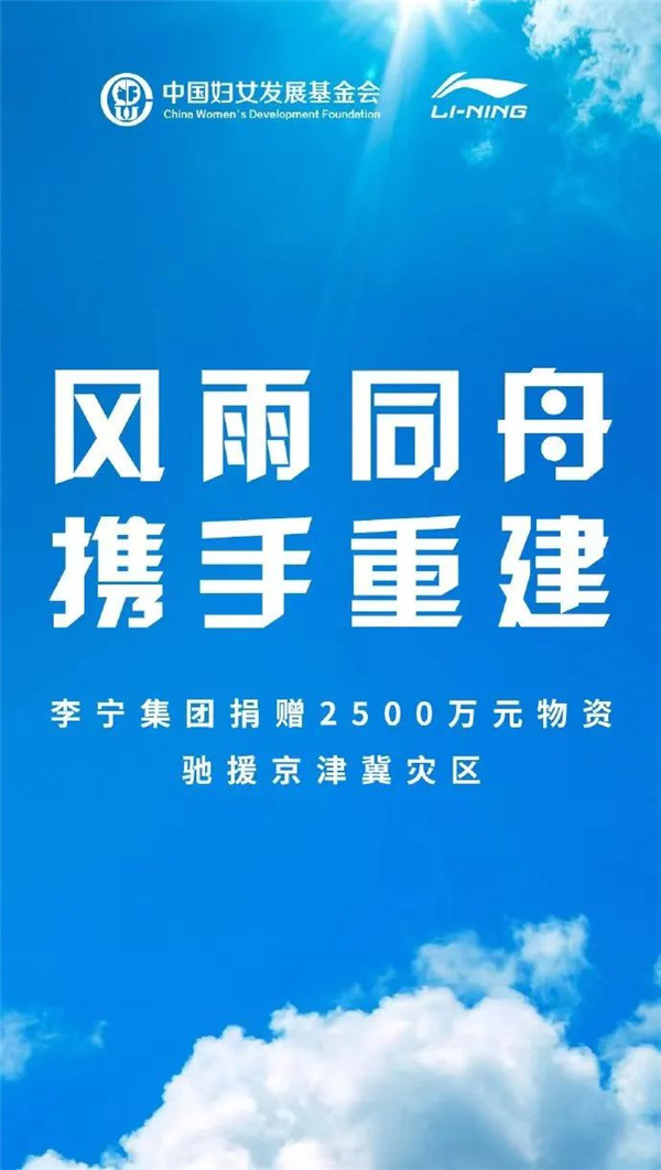 “风雨同舟,携手重建”,中国服装协会理事单位——李宁集团通过中国妇女发展基金会捐赠2500万元物资,用于支持京津冀抗汛救援及灾后重建工作。