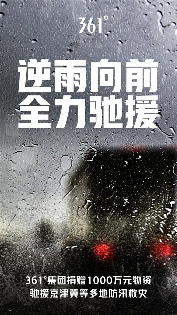 “逆雨向前,全力驰援”,中国服装协会理事单位——三六一度集团向中国青少年发展基金会捐赠1000万元物资驰援京津冀闽等多地灾区,为一线防汛救灾工作尽一份力。