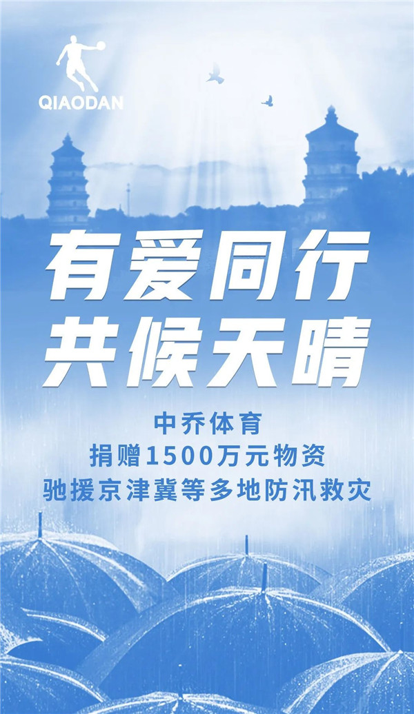 “有爱同行,共候天晴”,中乔体育捐赠1500万元物资前往京津冀等多地,帮助灾区渡过难关。