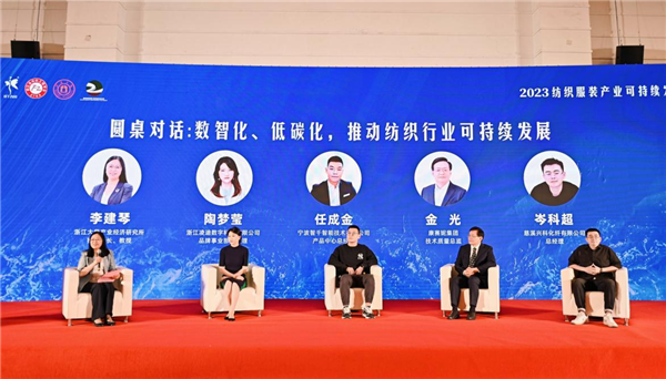 围绕“数智化、低碳化,推动纺织行业可持续发展”主题,浙江大学产业经济研究所执行所长及教授李建琴、浙江凌迪数字科技有限公司品牌事业部总经理陶梦莹、宁波智千智能技术有限公司产品中心总经理任成金、康赛妮集团技术质量总监金光、慈溪兴科化纤有限公司总经理岑科超针对“双碳与数字经济背景下纺织服装业可持续发展的挑战和机遇”“企业可持续发展实践”“纺织服装产业链绿色升级的困难与建议”等话题进行深入探讨交流,分享观点和经验。