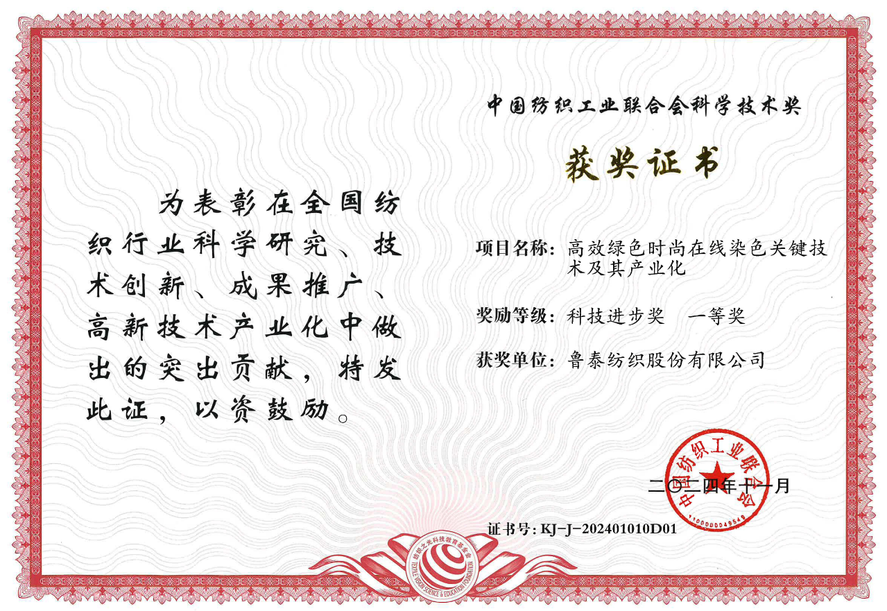 2024年度中国纺织工业联合会科学技术奖近日揭晓。由鲁泰纺织股份有限公司、武汉纺织大学、山东中康国创先进印染技术研究院有限公司、浙江伟峰机械有限公司等单位共同研发的“高效绿色时尚在线染色关键技术及其产业化”项目,荣获科技进步奖一等奖。