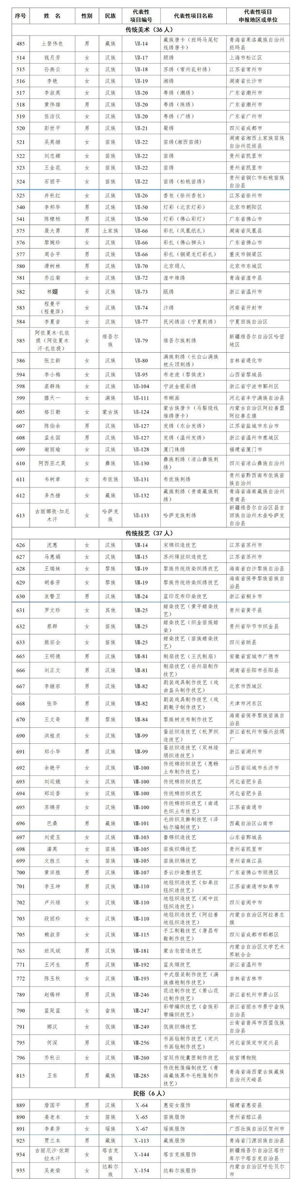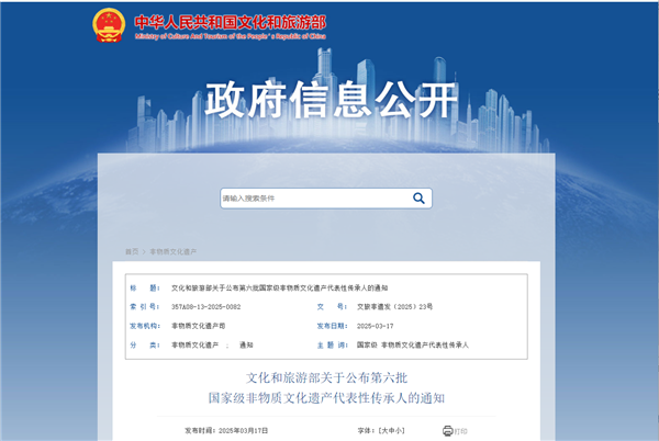 据了解,近年来,各地高度重视非物质文化遗产代表性传承人队伍建设,涌现出一大批德艺双馨、技艺精湛,在非物质文化遗产保护传承中发挥重要作用的典型代表。为加强非物质文化遗产传承人队伍建设,进一步提升非物质文化遗产系统性保护能力水平,保护和传承好非物质文化遗产,文化和旅游部组织开展第六批国家级非物质文化遗产代表性传承人认定工作。经推荐申报、材料复核、专家初评、社会公示、评审委员会审议等程序,确定了第六批国家级非物质文化遗产代表性传承人名单。