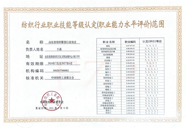 职业能力水平(认定)评价工作一直是山东省纺织服装行业协会的重点工作之一,由人才培育部具体负责组织开展。自1998年起,经省人社厅批复,省纺织职业技能鉴定站成立并挂牌于原省纺织工业协会,协会自此启动省内职业技能等级(认定)评价工作。后因政府职能改革推进,2019年协会取得中国纺织工业联合会下设纺织行业职业技能鉴定指导中心(以下简称“中心”)颁发的职业技能认定(评价)许可证;2021年,协会正式成为纺织行业职业鉴定指导中心分支机构,至今已开展评价工作 27 年,评价期间协会始终严格遵循国家及行业相关规定,在中心统筹指导下,立足业务范畴有序开展企业在职职工及院校学生的职业能力水平评价(认定)工作。