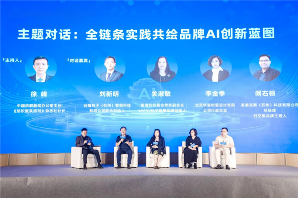 主题对话环节以“全链条实践共绘品牌AI创新蓝图”为核心议题,由中国纺联新闻办公室主任、《纺织服装周刊》杂志社社长徐峰主持,并邀请石榴粒子(杭州)智能科技有限公司联合创始人刘新明、香港纺织商会常务副会长及LAFAVEUR芸想品牌创始人关淑敏、北京华裳时装设计有限公司行政总监李金季、美泰克斯(苏州)科技有限公司总经理及时空集品牌主理人阙右根等嘉宾,共话品牌智慧升级的新路径与实践经验。