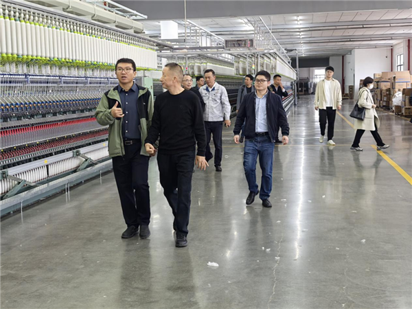 调研团来到张家港市天腾纱业有限公司,在深入考察长丝生产与加弹车间后,其成功构建的“从纺丝到纺纱”垂直一体化产业链,给调研团留下了深刻印象。
