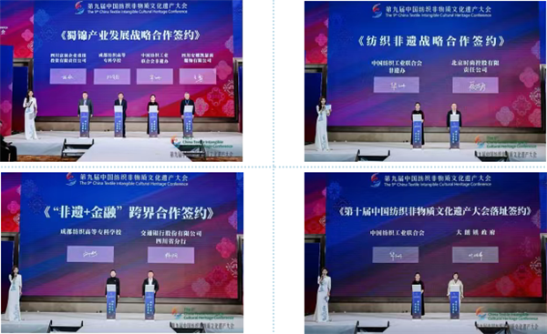 现场,中国纺织工业联合会非遗办与成都纺织高等专科学校、四川富润企业重组投资有限责任公司、四川安娜凯瑟莉服饰有限公司共同举行“蜀锦产业发展战略合作签约”;中国纺联非遗办与北京时尚控股有限责任公司进行“纺织非遗战略合作签约”;交通银行成都东部新区支行与成都纺织高等专科学校进行“‘非遗+金融’跨界合作签约”;值得一提的是,大会将于2026年迎来第十届,现场举行了中国纺织工业联合会与东莞市大朗镇“第十届中国纺织非物质文化遗产大会落址签约”,将传承的火炬继续传递。一系列的签约汇聚了国家级行业组织、专业高等院校、地方政府、金融机构和实力企业,标志着纺织非遗从技艺研究、产品开发到市场应用的完整产业链条被成功打通,为非遗新生注入了强劲动能。