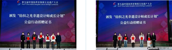 启动仪式上,还颁发了“纺织之光非遗设计师成长计划”公益行动捐赠证书,不仅是对无私奉献者的崇高致敬,更是对全社会形成“关注非遗、支持创新”良好风尚的积极引导与荣誉见证,让传承之路因更多人的点亮而愈发宽广。
