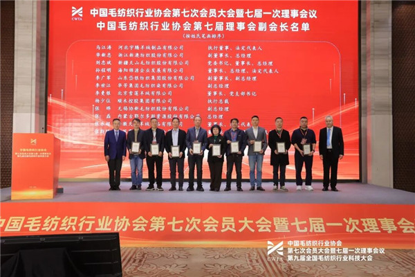 经全体与会代表投票,大会成功选举产生了中国毛纺织行业协会第七届理事会理事、第一届监事人选。刘家强当选中国毛纺织行业协会第七届理事会会长,刘焱、刘丹、马江涛、华新忠、刘忠斌、孙程明、李广军、李世江、李曼银、杨少位、张晔、张磊、张永超、张斯纬、陈锦照、罗朕心、周新祥、周淦华、郑浩生、孟霞、赵亮、闻宇、姜爱娟、徐导、程晓虎、谭小毅、薛正利等27人为副会长,张京炜为秘书长,张书勤为第一届监事。