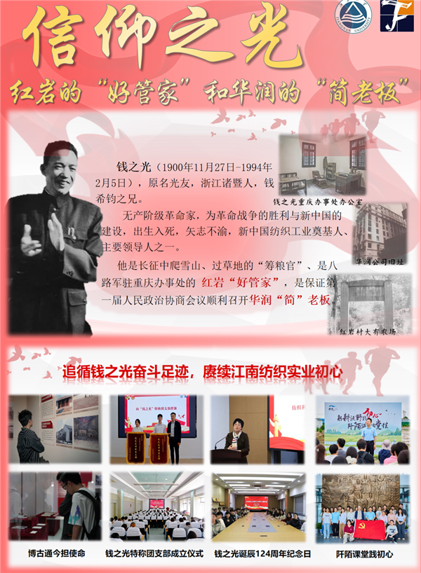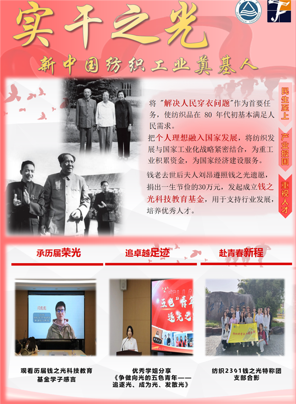 三载春秋,他们以实践为笔、以奋斗为墨,在青春画卷上写下了动人的篇章;三载躬行,他们以精神为灯、以使命为航,在成长道路上镌刻了闪光的足迹。恰逢钱之光先生诞辰125周年,让我们走进这个不平凡的团支部,聆听他们以青春名义许下的纺织强国誓言,感受那一份历久弥坚的初心与担当。