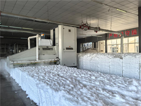 在生产车间,往复式抓棉机正在“吞吐”物料。新华社记者 田中全 摄