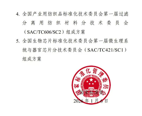 近日,国家标准化管理委员会发布2026年第1号公告,正式批准成立全国产业用纺织品标准化技术委员会非织造材料分技术委员会(SAC/TC606/SC1)和过滤分离用纺织材料分技术委员会(SAC/TC606/SC2)。两个标准化分技术组织的成立,标志着我国产业用纺织品行业在细分领域标准化建设上迈出关键步伐。