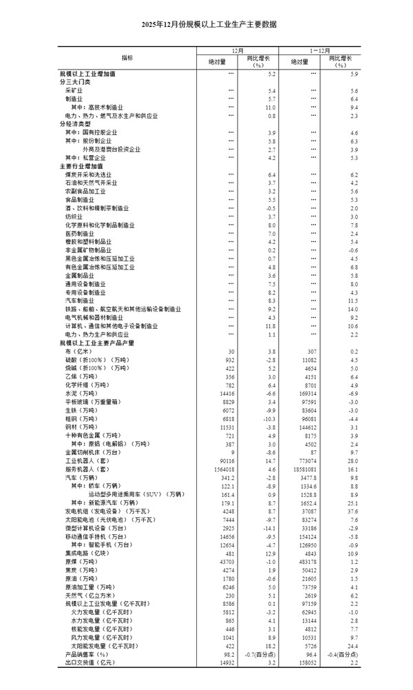 据国家统计局网站消息,2025年12月份,规模以上工业增加值同比实际增长5.2%(增加值增速均为扣除价格因素的实际增长率)。从环比看,12月份,规模以上工业增加值比上月增长0.49%。2025年,规模以上工业增加值比上年增长5.9%。