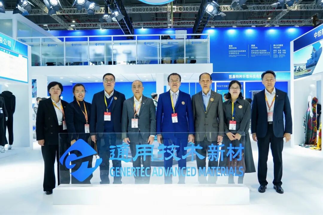 展会现场,中国纺织工业联合会副会长李陵申,中国工程院院士、生物基纤维材料全国重点实验室主任程博闻,中国纺织工业联合会专家咨询委员会委员曹学军、贺燕丽,中国化学纤维工业协会会长陈新伟,中国纺织机械协会会长顾平,中国纺织工业联合会研究室(非遗办)主任华珊,中国化学纤维工业协会副会长靳高岭,中国化学纤维工业协会原副会长姜俊周等领导莅临展位,期间围绕新技术与新产品研发进展、实际应用场景及未来市场推广进行了深入交流。通用技术新材董事长、党委书记、总经理姜俊华,副总经理于捍江、李开占,集团派驻通用技术新材股权董事朱北娜,通用技术中纺院副总经理崔桂新等陪同参观并进行了详细介绍。