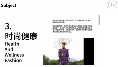 消费者对健康的关注延续到时尚行业,健康的生活方式成为一种潮流的时尚态度。开发注重舒适性、功能性和保健性的时尚系列 ,使用自然无污染的面料 ,配合生产制作流程的改进,开发更多能监测生命体征 ,促进更好体态 ,舒缓身体压力,或更具有创造性并促进健康生活的生物或智能时尚用品。