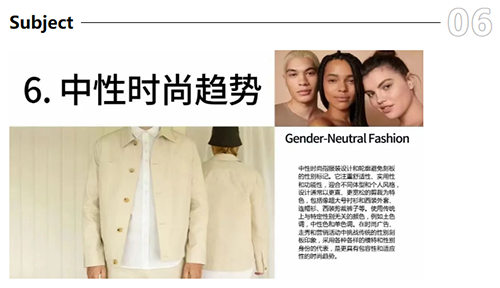 中性时尚指服装设计和轮廓避免刻板的性别标记。它注重舒适性、实用性和功能性,迎合不同体型和个人风格,设计通常以更直、更宽松的剪裁为特色,包括像超大号衬衫和西装外套、 连帽衫、西装剪裁裤子等。使用传统上与特定性别无关的颜色,例如土色调、中性色和单色调。在时尚广告、走秀和营销活动中挑战传统的性别刻板印象,采用各种各样的模特和性别身份的代表,是更具有包容性和适应性的时尚趋势。
