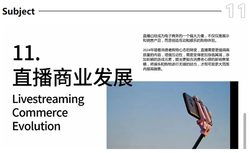 直播已经成为电子商务的一个强大力量,不仅仅是展示和销售产品,而是创造互动和娱乐的购物体验。2024年随着消费者购物心态的转变,直播需要更强调高质量的内容,增强互动性,需要变得更加身临其境,添加新颖的游戏元素 ,提出更贴合消费者心理的新销售策略 ,将娱乐和购物进行无缝的结合,才有可能更大范围内提高销售。
