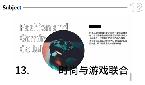 时尚品牌和游戏平台之间进行更多深度合作 ,包括各种创意性的虚拟时尚和游戏文化的融合 ,发布限时的游戏内角色服饰, 举办游戏主题的VR时装秀 ,游戏玩家的虚拟试穿,线下的限量版实体服装销售。
