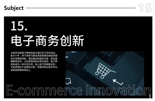 中国在创新电子商务实践方面已处于领先地位。到2024年 ,电子商务可能会演变成更加身临其境的在线购物体验 ,更加真实的虚拟试穿、配合直播购物活动 ,以及更高效的标准化物流 ,电子商务将成为一种生活日常。线上线下的购物区别 ,不能停留在产品线的分割 ,而要体现出更多样化、更新颖的购物体验上。