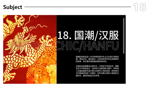 国潮的创新应进一步对传统和现代本土文化进行深度挖掘,更地方化、更社群化,以时尚的多样性去探索更多的创意 ,吸引更多消费者的眼球和共鸣。汉服的创新需要突出现代化,不拘泥于传统形式,要更专注于对传统设计、技术和工艺的创新与提升,将传统工艺基础提炼并进行现代化制作工艺的改进,将传统与当代服装结构进一步融合,创作出能让更多人接受的汉服样式,更好地促进文化传承。