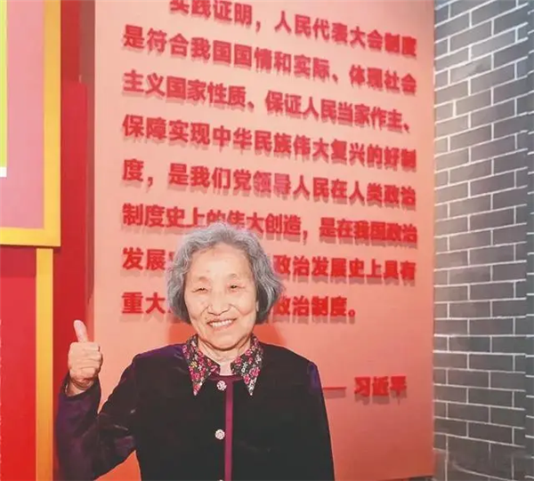 △看到“人民代表大会制度的建立——中山堂印记”展览中习近平总书记在中央人大工作会议上的讲话,刘世梅代表竖起大拇指点赞。摄影/薛睿杰