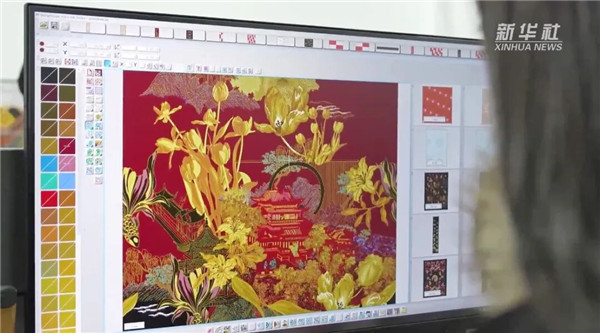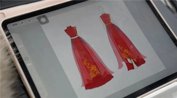 在海宁中国家纺城时尚面料设计中心,汉服设计师李珍珍正在数位板上勾勒线条。屏幕上,宋代画家赵伯驹笔下的《仙山楼阁图》与杭州西湖十景叠合,百合、金鱼等纹样点缀其间,寓意“百年好合”“金玉满堂”,这是一款独具匠心的婚服。