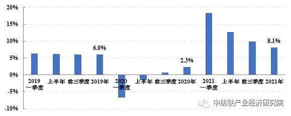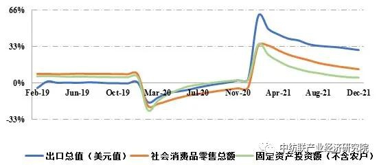 2021年,虽然遭遇国内疫情散发及国际市场供需形势复杂等多重压力,我国宏观经济仍实现持续恢复发展,经济增速居全球前列。统计数据显示,2021年我国国内生产总值(GDP)达114.4万亿元,同比增长8.1%,以2019年为基期计算(下同),两年平均增长5.1%;全国社会消费品零售总额、出口总额(美元值)和固定资产投资完成额(不含农户)同比分别增长12.5%、29.9%和4.9%,两年平均分别增长3.9%、16%和3.9%。其中,社会消费品零售总额两年平均增速虽然尚未恢复至疫情前水平,但最终消费支出对GDP的增长贡献率达到65.4%,居“三驾马车”之首,表明国内大循环的主体作用逐步增强。在国际供应链运转不畅的情况下,我国制造业的体系化优势充分显现,货物贸易出口总额实现快速增长,净出口对GDP增长的贡献率达到20.9%,明显高于疫情前水平。全年,规模以上企业工业增加值和利润总额同比分别增长9.6%和34.3%,两年平均分别增长5.8%和18.2%,表明工业企业生产经营情况均处于平稳改善状态。