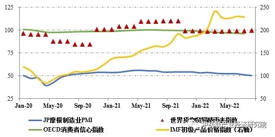 今年以来,疫情反复、地缘冲突长期化、国际金融环境收紧等复杂因素持续冲击全球经济复苏进程,三季度通胀全面高企、北半球异常高温干旱天气使得供需矛盾加剧,经济增长放缓态势较为明显。8月,J.P. Morgan全球制造业采购经理人指数(PMI)为50.3,创26个月以来新低,仅略高于荣枯线以上,其中新订单指数为48.2,市场需求持续低迷,全球经济复苏动能趋弱。7月OECD消费者信心指数为96.2,已连续12个月位于收缩区间,今年以来呈逐月放缓态势。三季度WTO全球货物贸易晴雨表指数回升至100基准水平,但低于上年同期10个百分点。全球大宗商品价格较一季度高位水平小幅回落,但7月IMF初级产品和能源价格同比仍分别增长38.4%、90.1%,通胀压力仍未缓解,近四成OECD成员国CPI涨幅超10%。