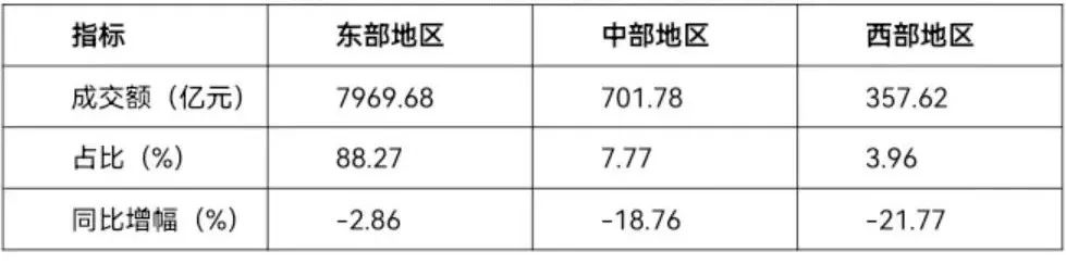 从区域结构看,1-9月,46家重点监测市场中,东部地区专业市场成交额为7969.68亿元,同比下降2.86%,占到专业市场总成交额的88.27%;中部地区专业市场成交额为701.78亿元,同比下降18.76%,占到专业市场总成交额的7.77%;西部地区专业市场成交额为357.62亿元,同比下降21.77%,占到专业市场总成交额的3.96%。