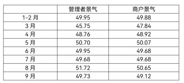 景气方面,2022年1-9月,纺织服装专业市场管理者景气与商户景气走势基本一致。管理者景气平均指数为49.53,商户景气平均指数为49.48,均低于50荣枯线;1-9月专业市场运管理者与商户整体信心不足,景气指数偏低。