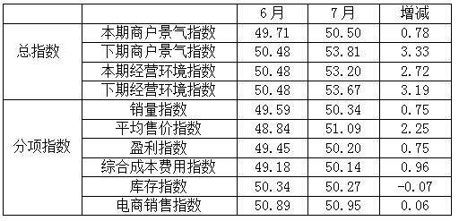 分项指数中,销量指数为50.34,比6月的49.59上升0.75个百分点;平均售价指数为51.09,比6月的48.84上升2.25个百分点;盈利指数为50.20,比6月的49.45上升0.75个百分点;综合成本费用指数为50.14,比6月的49.18上升0.96个百分点;库存指数为50.27,比6月的50.34下降0.07个百分点;电商销售指数为50.95,比6月的50.89上升0.06个百分点。