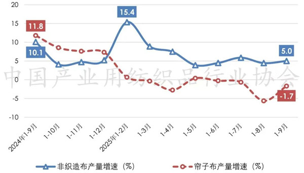 自2025年以来,我国非织造布产量呈现出“高开、回落、趋稳”走势,根据国家统计局数据,2025年1-9月规模以上企业的非织造布产量同比增长5%,月均产量较二季度提升12.2%。帘子布市场需求放缓,产量整体处于负增长区间,1-9月规模以上企业的帘子布产量同比下降1.7%(图2)。