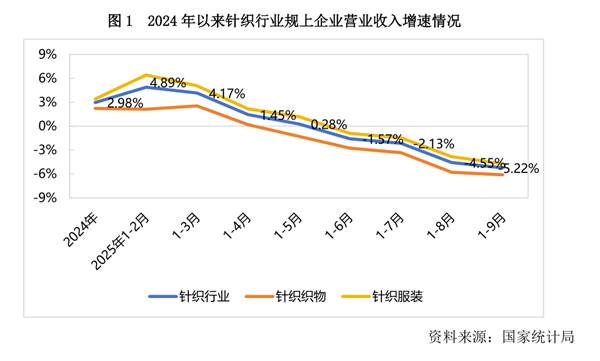据国家统计局统计,2025年1—9月针织行业规模以上企业营业收入同比下降5.22%;降幅较前期进一步扩大,较1—6月扩大了3.65个百分点。行业营业收入同比增速自今年二季度起开始放缓,并出现负增长。从针织两大类产品的分行业来看,1—9月针织织物规上企业营业收入同比下降6.10%,针织服装规上企业营业收入同比下降4.72%。
