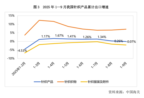 据中国海关数据统计,2025年1—9月我国针织产品出口克服美关税政策扰动等外部影响,在复杂的全球贸易环境下展现出一定韧性,同时细分品类与市场的差异化特征愈发突出。期间,我国针织产品出口809.75亿美元,同比微降0.07%;降幅低于全行业平均水平,针织行业出口基本面相对稳健。