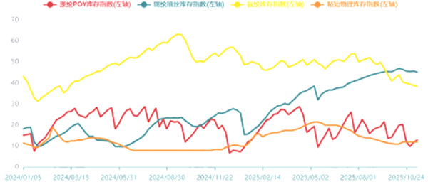 库存方面,涤纶长丝受益于5月中旬企业集中安排停产检修,5、6月库存去化进程加快,7月库存有所回升并在中旬达到26天(以POY为例),此后呈现震荡下降趋势,10月末降至9天(图2)。锦纶库存大幅增加,虽然二、三季度减产幅度扩大,但仅是减缓了库存上升的速度,10月末升至46天。氨纶库存则延续2024年下半年以来的高位震荡态势,上半年基本维持在50天左右;7月下旬库存出现下降趋势,10月末降至40天。