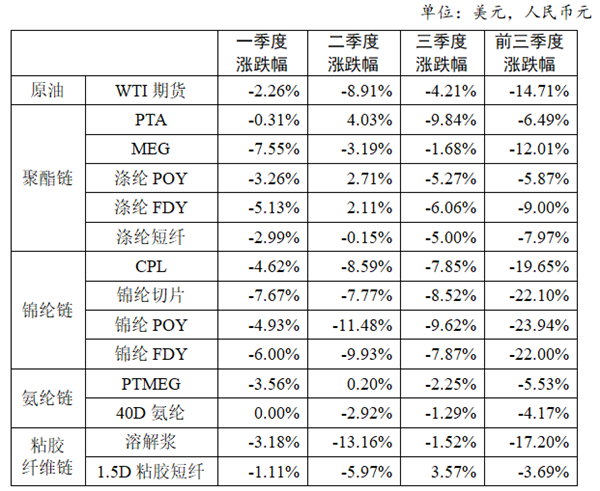 由于原料端支撑减弱,化纤产品市场价格同比下降。聚酯链方面,一季度纤维产品价格跌幅普遍大于其原料跌幅,压缩盈利空间;二季度纤维产品价格虽上涨,但涨幅普遍不及其原料涨幅,再度压缩盈利空间;三季度纤维产品价格虽处于下滑趋势,但其原料降幅更为明显,加工差有所扩大(图3)。锦纶链方面,前三季度各环节价格下滑态势明显,跌幅均在20%左右(图4、表1)。