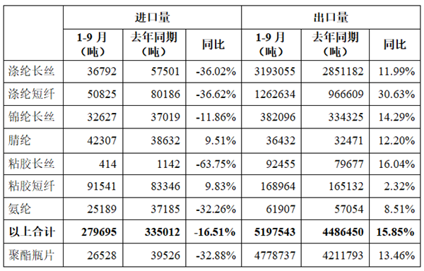 据中国海关数据统计,1-9月化纤主要产品累计出口520万吨,同比增加15.85%,继续保持增长态势(表2)。其中,涤纶长丝出口量同比增长11.99%,1月和5月月度出口量均接近40万吨;涤纶短纤出口同比增长30.63%,5月和8月月度出口量均在16万吨以上。