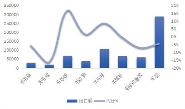 毛纺中间与成品出口形势较上半年则呈现一定回落。毛纱线出口2.7万吨,同比增长10%,增速较上半年下调2.5个百分点;出口额7.1亿美元,同比增长17%,增速较上半年下滑1.8个百分点。羊毛衫出口6387万件,同比增长13.7%,增速较上半年减少13.8个百分点;出口额10.9亿美元,同比增长8.8%,增速较上半年下滑9.6个百分点。毛梭织服装出口1528万件,同比下跌0.7%,较上半年回落11.3个百分点;出口额6.3亿美元,同比下跌7%,跌幅较上半年扩大3.7个百分点。