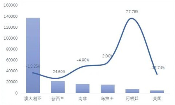 2025年1~10月中国进口主要产毛国羊毛数量与同比情况(单位:吨,%)