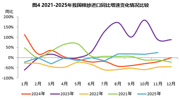 据海关统计数据,2025年11月我国棉纱进口量15万吨,环比增加1万吨,增幅为7.7%,同比增加3万吨,增幅为25%。2025年1-11月累计进口棉纱133万吨,同比减幅2.92%。