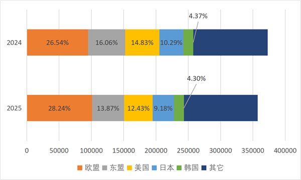 2024-2025年1-11月羊毛原料及羊毛为主要原料的制品出口市场份额变化情况(单位:万美元)