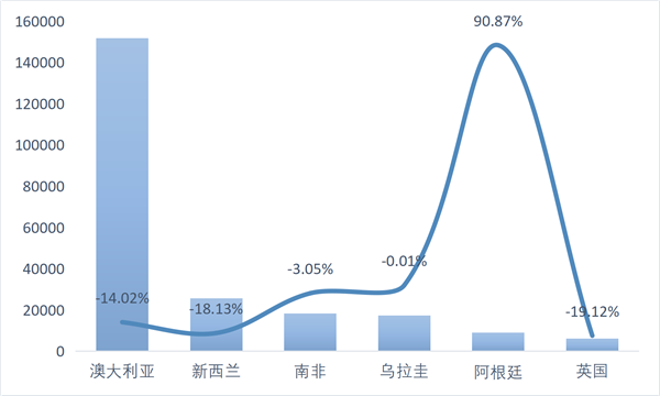 2025年1~11月中国进口主要产毛国羊毛数量与同比情况(单位:吨,%)