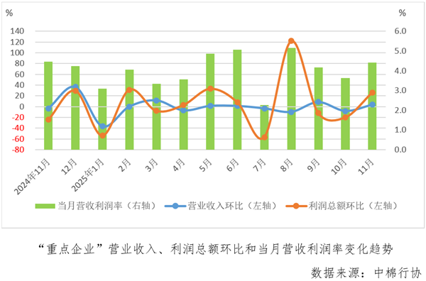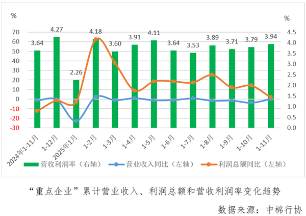 据中国棉纺织行业协会跟踪的重点企业(以下简称“重点企业”)数据, 1-11月份,“重点企业”营业收入同比增长0.2%,较1-10月份由降转增,利润总额同比增长1.8%,较1-9月份增速下滑12.3个百分点,营收利润率为3.94%,较1-10月份扩大0.15个百分点。