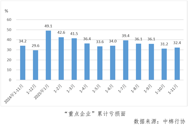1-11月份,“重点企业”累计亏损面为32.4%,较1-10月份扩大1.1个百分点。11月份当月亏损面为36.6%,较10月份收缩2.9个百分点。