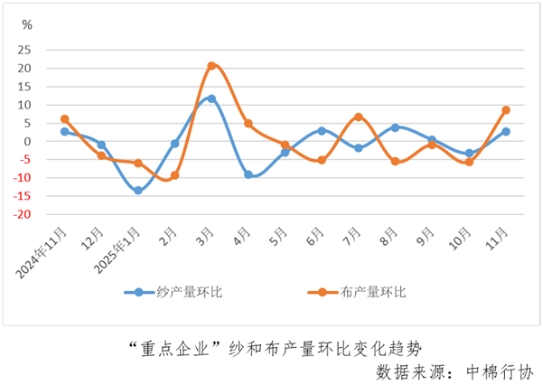 1-11月份,“重点企业”纱产量同比增长3.1%,布产量同比增长4.5%,均较1-10月份增速放缓0.3个百分点。11月份当月纱产量环比增长2.8%,布产量环比增长8.5%,均由上月环比下降转为增长。