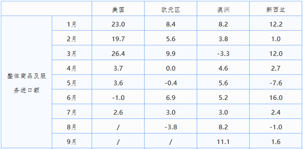 2025年1-9月,美国、欧元区、澳大利亚(包括纺织品、鞋)、新西兰(包括纺织品)进口增速均较上半年有所放缓。澳大利亚纺织品、服装和鞋类进口同比增长7.1%,增速比1-6月放缓1.6个百分点。新西兰纺织服装进口同比增长2.3%,增速比1-6月放缓1.5个百分点。