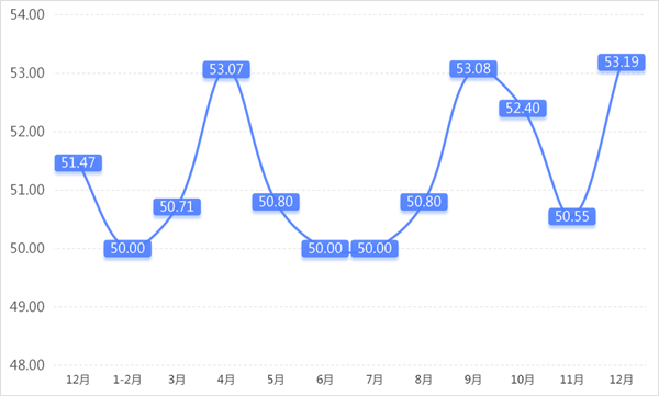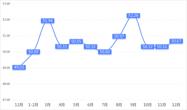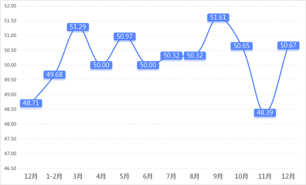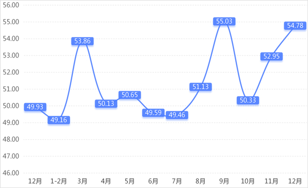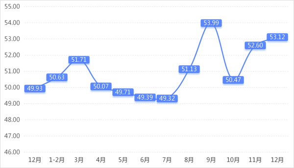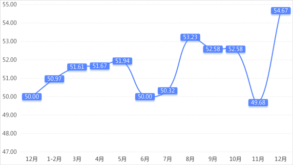 从管理者景气指数来看,总指数中,12月管理者景气指数为52.17,较上期上升1.42个百分点;经营环境指数为52.33,较上期上升1.04个百分点。
