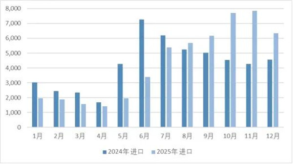 2025年,羊绒原料及制品进口呈现“前低后高”的明显走势,与2024年“年中高位”的节奏形成鲜明对比,反映市场需求周期的变化特征。