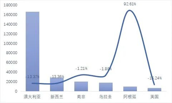 2025年中国进口主要产毛国羊毛数量与同比情况(单位:吨,%)