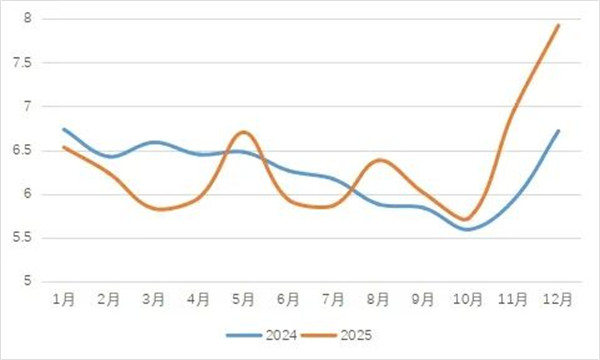 2024-2025年进口羊毛月平均价变化情况(单位:美元/千克)
