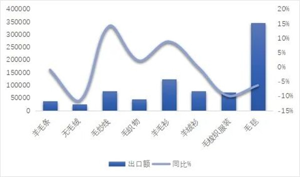 据中国海关数据显示,2025年毛纺原料与制品出口额122亿美元(折合人民币871亿元),同比微跌0.9%,基本恢复至上年同期水平。